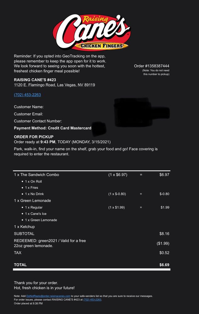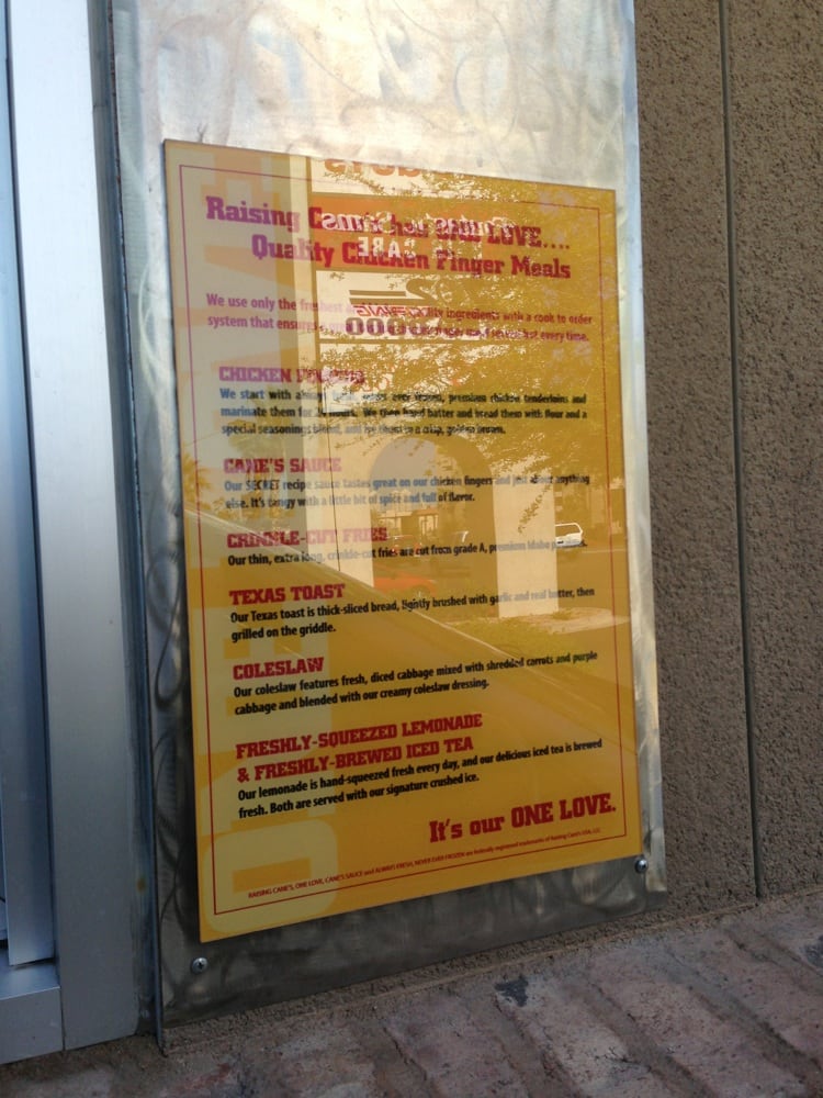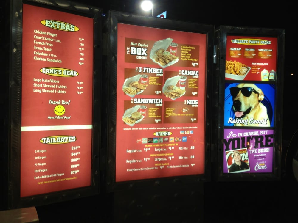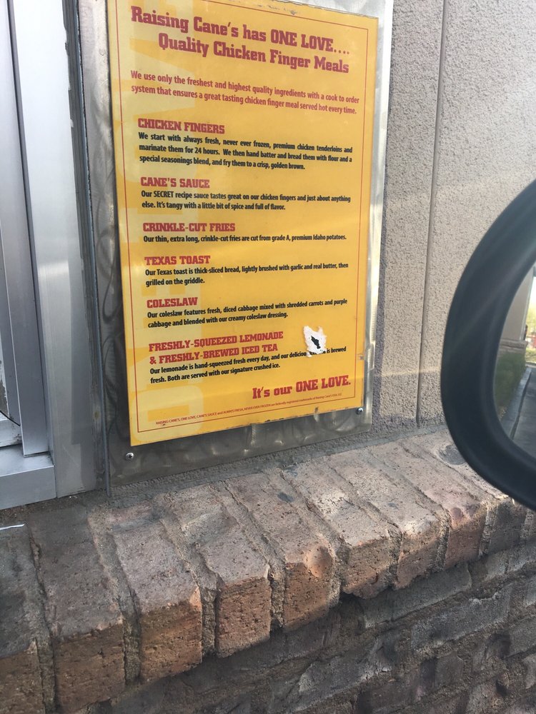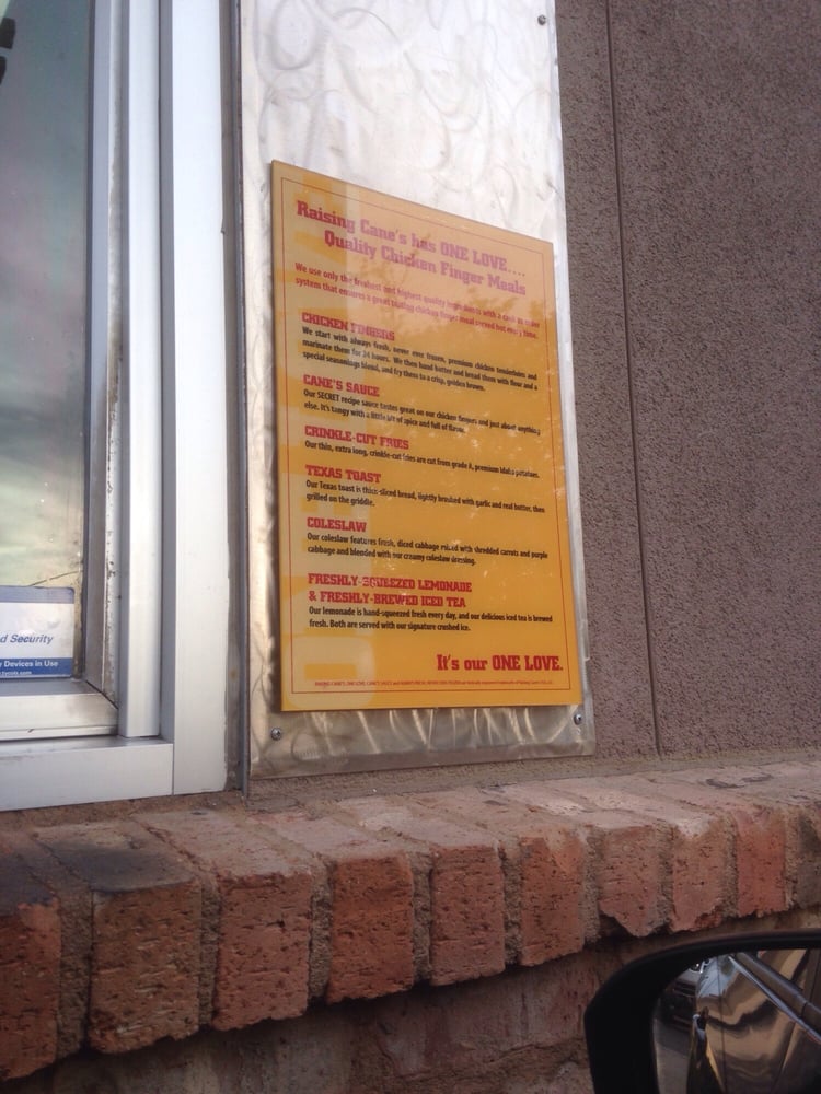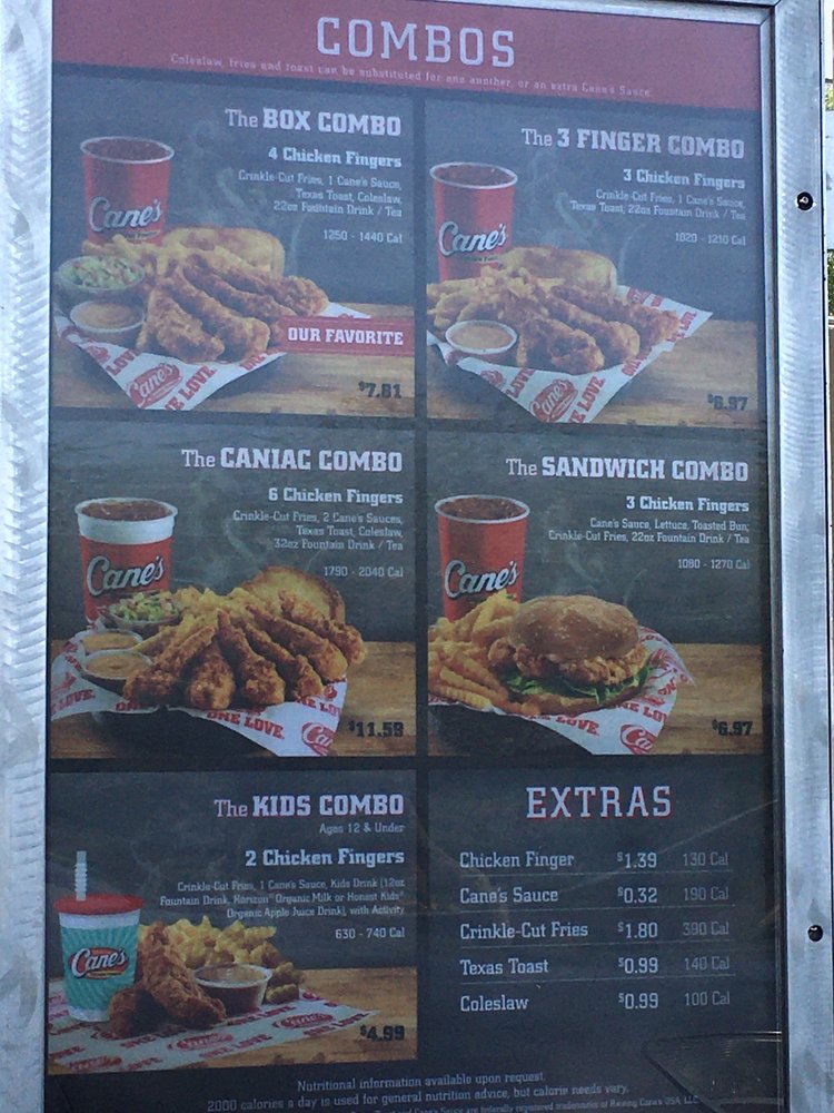 3 chicken fingers, Cane's sauce, lettuce, kaiser roll, fries and 22 oz. regular drink.