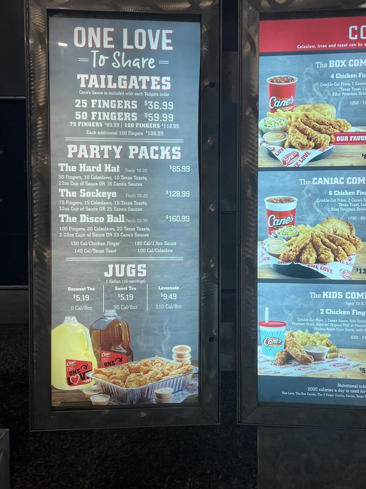4 chicken fingers, fries, coleslaw, 1 Cane's sauce, Texas toast, coleslaw and 22 oz. regular drink.